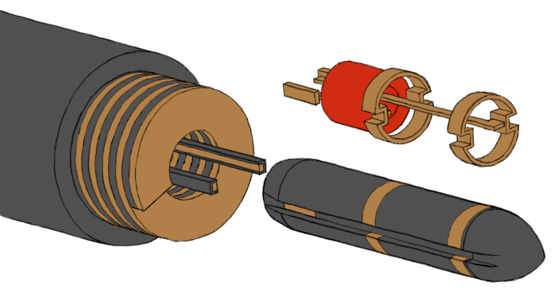 Diagram of the internals of a helical railgun. The stator, including the rails and the helical winding, are on the left and form a barrel (covered with a mechanical support to withstand the forces of firing). The full projectile is shown on the right bottom, and the active portions of the electrical system of the projectile at top right. Copper-colored material is conductive, grey material is insulating, and the red indicates a winding of an electromagnet.
