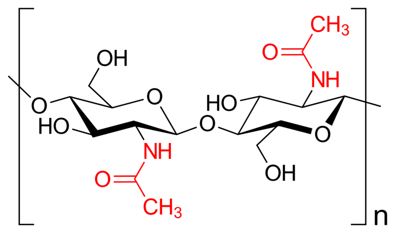 Structural formula of chitin, with acetylamino moieties highlighted in red.