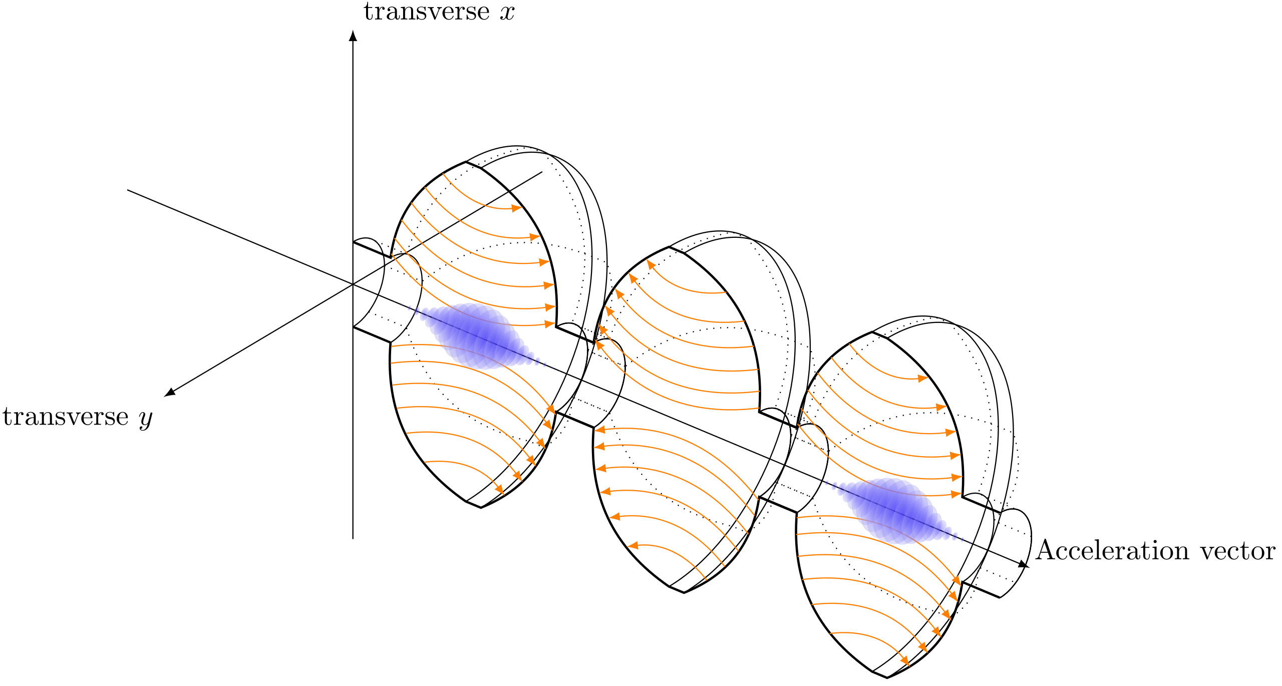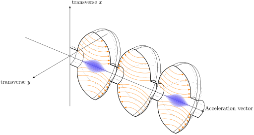 Resonant Acceleration cavity, with the electric field shown and how bunches are accelerated inside of it.
