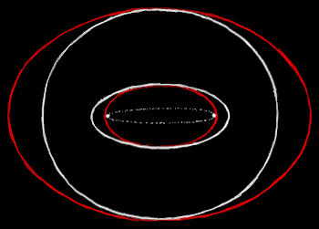 A diagram of the features of the Kerr geometry, showing the inner and outer event horizons (white ovals), outer boundary of the ergosphere (outer red oval), inner surface of infinite redshift (inner red oval) and ring singularity(dotted oval).