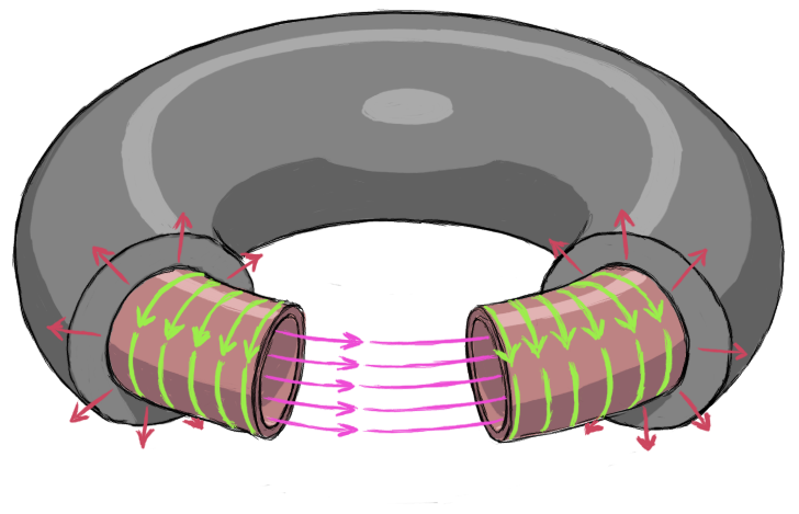 A cutaway view of a Superconductive Magnetic Energy Storage torus. The electric current (green) flows around an inner toroidal winding of superconductive wire. This generates a powerful magnetic field in the empty space inside the winding (magenta) that stores the energy of the device. The action of the magnetic field on the very same current that creates it gives a powerful outward force (red) on that current and the substance through which it flows. To counteract this force and keep the superconductive winding from bursting, a thick supportive jacket of strong material is wrapped around the winding.