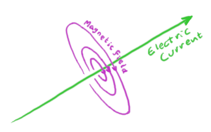 The magnetic field (magenta) circulating around a cross sectional plane perpendicular to the direction of an infinite line of current (green). |