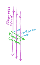 A magnetic field exerts a force on any electric currents going through it. The force is in the a direction perpendicular to both the magnetic field and the current, and is proportional to both.