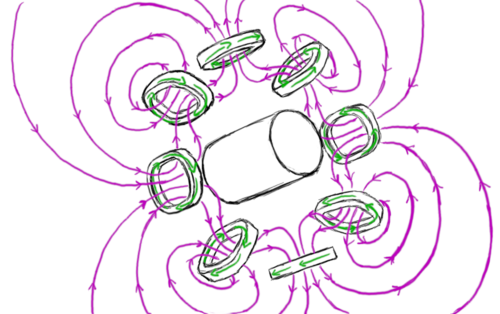A spacecraft with a Halbach array for a shield. A Halbach array is a sequence of magnets each rotated by 90 degrees from the previous, so that their fields add on one side and cancel on the other. By making the field cancel in the interior of the Halbach ring, the habitation module can be kept relatively field-free. The magnetic fields are shown in magenta and the current loops in green. Desiati and D'Onghia[45] estimate that a practical design could cut the dose from of 10 MeV protons by approximately 90% and 100 MeV protons by approximately 70% (dose from GeV protons would be essentially unchanged).