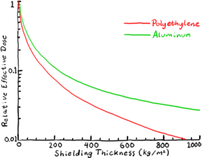 In space, it is expensive to carry this much shielding. Even worse, a moderate amount of shielding might make things worse, by allowing the impacting cosmic rays to produce more secondary particles[8]. For light elements, shielding seems to give some moderate benefit for low thickness but once the thickness reaches on the order of 300 - 500 kg/m² the dose often plateaus or even rises over a considerable range; often only declining again at thicknesses of around 2 tons per square meter or more. The specific details depend on the material and the spectrum of cosmic rays for this part of the solar cycle. Because the way that cosmic radiation damages cells is not known in detail, the model used for radiation damage can significantly impact the conclusions about how much good (or harm) a given amount of shielding does. The best shielding uses hydrogen-rich materials with only light elements to limit the secondary radiation. One of the preferred materials is polyethylene, composed of two hydrogens for each carbon atom and naught else[9]. Water is also good, and liquid hydrogen, if you can store it, provides the best shielding of all. On a planetary or sub-planetary body lacking an atmosphere, native ice or regolith could be used as shielding by piling it over and around any facilities[10][11].