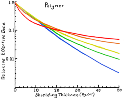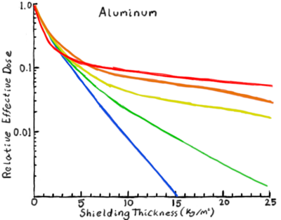 Relative dose of solar flare x-rays for a given thickness of polymer or aluminum shielding[16]. Different curves show different flare spectral distributions of x-rays.