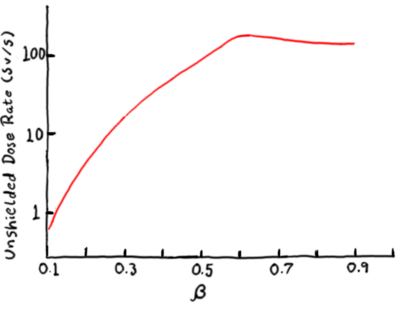 The rate at which an unshielded individual will take radiation dose as a function of speed β = v/c relative to light speed[31].