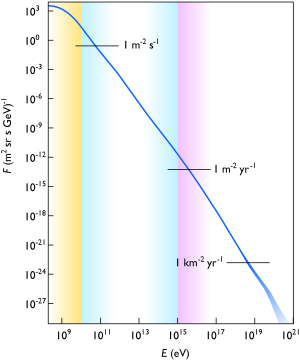 Cosmic flux versus particle energy at the top of Earth's atmosphere.