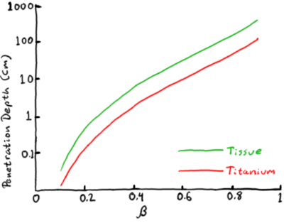 Stopping distance of protons in titanium and living tissue as a function of speed β = v/c relative to light speed[31].