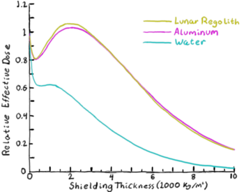 Relative effect of radiation (compared to no shielding) behind different thicknesses of water, aluminum, and lunar regolith[10].