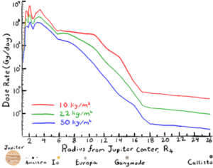 Radiation dose rate with distance from Jupiter's center, as measured in Jupiter radii[24].