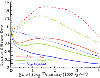 Comparison of aluminum, lunar regolith, and polyethyene shielding as a function of thickness at both solar minimum (solid lines) and solar maximum (dashed lines) galactic cosmic ray conditions[11].