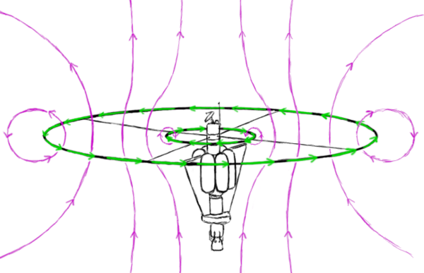 A spacecraft shielded with an unconfined magnetic field, created by two simple current loops (green) with the resulting magnetic field shown in magenta. The inner current loop cancels the field of the outer loop in the vicinity of the spacecraft, yet allows a net magnetic dipole moment for deflection of incoming particles.