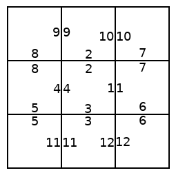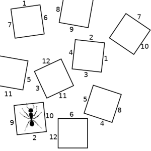 So lets consider a hypothetical scenario, where an ant can be in any of several states, represented by the squares in the pictures below. The ant can transition to any other state that has a numbered side with the same number as the state it is in. We will start on the left. If the ant chooses the "2" transition, we end up with the picture in the middle. If it then chooses the "10" transition, we end up with the state on the right.