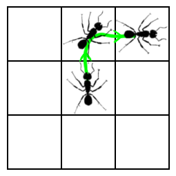 But now notice that the behavior of this system is exactly the same as if we re-arrange the states into a grid, as shown below on the left. The disconnected states now become a space; an expanse of coordinates on which the ant can exist. Now, the ant's transition between states can be described as a trajectory as shown in the right picture below.