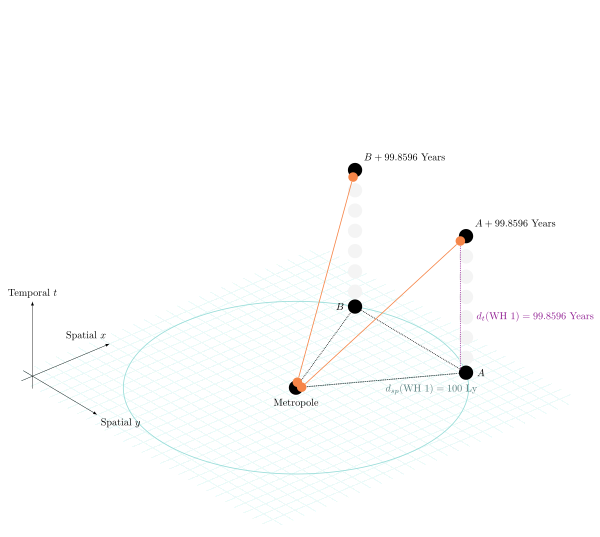 Let’s assume we have two nodes A and B ten light years apart. They both had connections established from a parent node P. Those connections are time-shifted over 99 years and part of the privileged base graph.