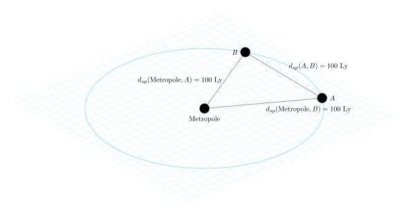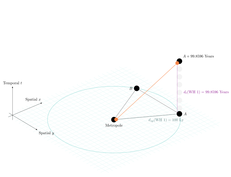 This works even when both ends connected don’t have the same time distance from the root node - the important thing is that the new shortcut accomodates this difference with a time shift of its own. We can calculate this difference easily. For two non-root nodes A,B, for each node we sum the temporal difference over the path from root to the nodes along the red graph, then subtract the difference from each other. The resulting remaining temporal difference is that the new connection on the blue graphh must have to keep the network stable. This means we can even do things like connect systems far out directly to core systems, or bridge from one edge of the graph to the other - arbitrary routings are possible. These routings can allow faster signal transmission and mass transport than through root, mitigating bandwith issues. The main problem is to watch out for network stability. As nodes accumulate, CTC avoidance becomes more and more delicate, and safety spacing must be maintained diligently. This can add to the effective travel time through such alternate connections, and thus maintains some of the "privilege" of the acyclic base graph.