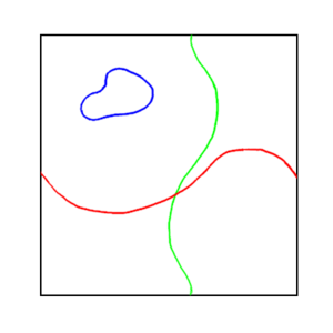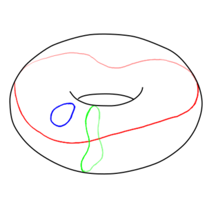 If you take a plane or a sphere, any closed loop on the manifold can be shrunk in a continuous manner until it vanishes. This is called simply connected. But not all manifolds are simply connected. Those which are not simply connected are called multiply connected. The most basic multiply connected manifold is a torus, like a bagel or doughnut or bicycle inner tube. While there are closed loops on a torus that can be shrunk to a point and made to vanish, those that go all the way around the torus tube cannot – they'll get caught up circling the tube. Likewise, loops that go all the way along the tube will get caught up on the central hole if they are shrunk and again cannot be made to go to a point.