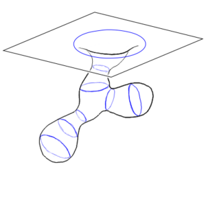 Note that if you are connecting two regions in the same universe, your new geometry will be multiply connected. A loop that goes through the wormhole and then connects back up outside the wormhole cannot be shrunk to a point. There will now be two equivalent ways to get between any two points – the path that goes through your usual space-time, and the path that goes through the wormhole. If you use a wormhole to connect two separate universes, the combination of the two universes and the wormhole can still be simply connected.