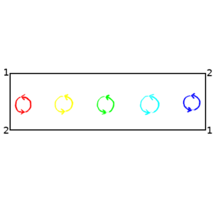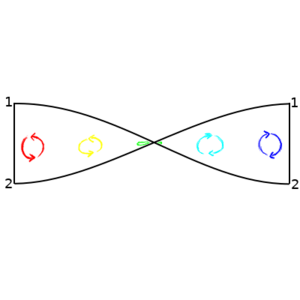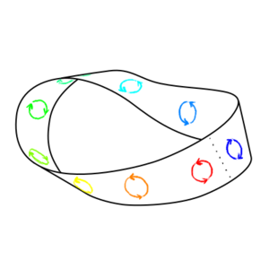 And there is one other interesting kind of manifold that is relevant to wormholes – manifolds that are non-orientable. An orientable manifold is one where you can define a consistent sense of clockwise and counter-clockwise everywhere on the manifold. If you start with a clock spinning clockwise, or a right-handed glove, or a copy of Lewis Carrol's "Through the Looking-Glass, and What Alice Found There", you can move it anywhere on the surface and if it meets back up with itself it will still be spinning clockwise, or right handed, or normally readable. But in a non-orientable surface, there are ways you can move the object so that when you get it back to where it originally was the clock is spinning counter-clockwise, or the glove is left-handed, or the book is written in mirror writing. The simplest example of such a surface is a Mobius strip. As shown below, if you move an oriented circle around the strip, it comes back with the opposite orientation.
