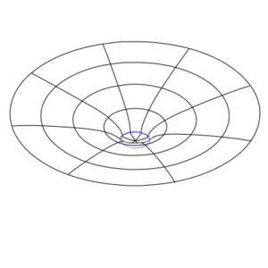 One way of trying to envision a curved space, and to gain some intuition about them, is to take a two-dimensional slice of that curved space and embed that in a flat three-dimensional space. This is called an embedding diagram. Remember that this is a reduced representation that throws away a lot of the information (unless there are special symmetries you can exploit) and is not actually the thing being described.