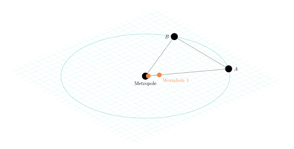 We couldn’t build a time-shifted connection between A and B without causing a CTC to be formed. But we are entirely fine sending signals Fast-as-Light from A to B and back. This is not a violation. Now consider: how does a wormhole with no time shift across it behave? In the mesh network case, such connections don’t cause CTCs to appear. And it doesn’t cause one to appear here either. How can we build such connections? We can of course use projection with relativistic speeds at both ends, like how we would build Mesh networks. But there is an even faster solution. If we can move wormholes through wormholes, we can shift the new mouths through the existing network to create this connection!