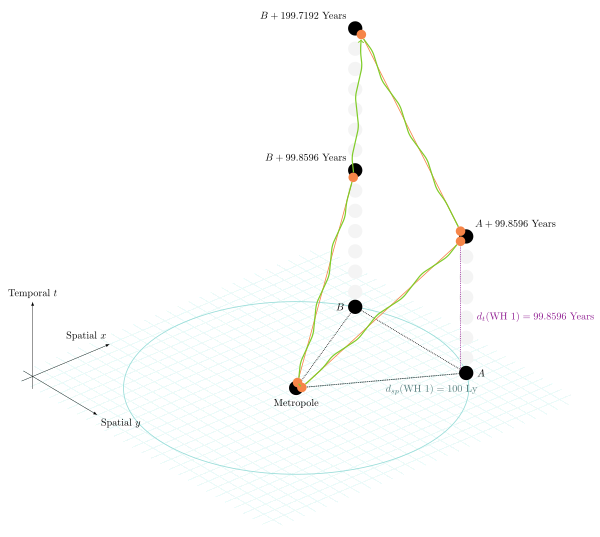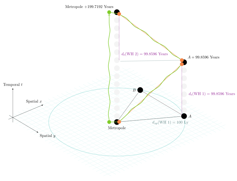 The main catch is that we have to tightly watch out for temporal drift on such new connections. Through adding such edges that overall form a "blue graph" on top of the red graph, we are creating loops on the red graph underpinning the network. If one end of a wormhole mouth drifts more in time than the other (which will inevitably happen because stars won’t have the same mass, experience the same galactic gravity, or have the same velocity relative to each other) the conditions for a CTC will start to appear. The only way to pre-empt this is with continuous maintenance, taking connections offline and adjusting their temporal position using synchrotons, and having "safety space-time" spacing between wormholes. In this way, there is some "room" where signals can arrive faster and faster, but not before they were sent, allowing the connection to be used most of the time with only short intervals of adjustment.