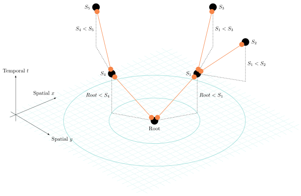 Every projected connection thus extends onto the future. Then we must avoid forming loops, or more generally "backtracking" back towards a dispatched node. This nets us a graph with no closed loops - an acyclical graph, also called a tree. Since connections may not return to previously established nodes if they are time-shifting from the past into the future, we also get a partial order: nodes u that dispatch wormholes have a higher order over the nodes v they establish: u < v. This lets us establish a direction on the whole graph. For a particular node n, its parent node established it, parent(n) < n, and it in turn establishes children nodes, n < child(n). The node that only has children nodes is the tree's root node. Nodes that have no children are leafs of the tree. The trees height is the longest outward path one can take from the root to a leaf.